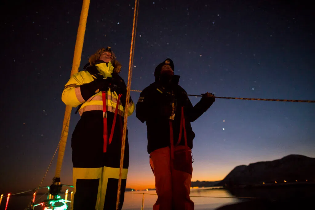 Joining us you will get the opportunity to challenge yourselves, regardless of ability. We love sailing because of the possibilities to challenge oneself and get the rewarding feeling of mastery afterwards. We take pride in creating a safe and secure arena for trial and error, challenge and mastery. Whether it is at the helm of the boat, in crampons on a glacier, skiing down a mountainside or with a camera at the top of the mast, you will return home as a happier, more experienced and more confident person.