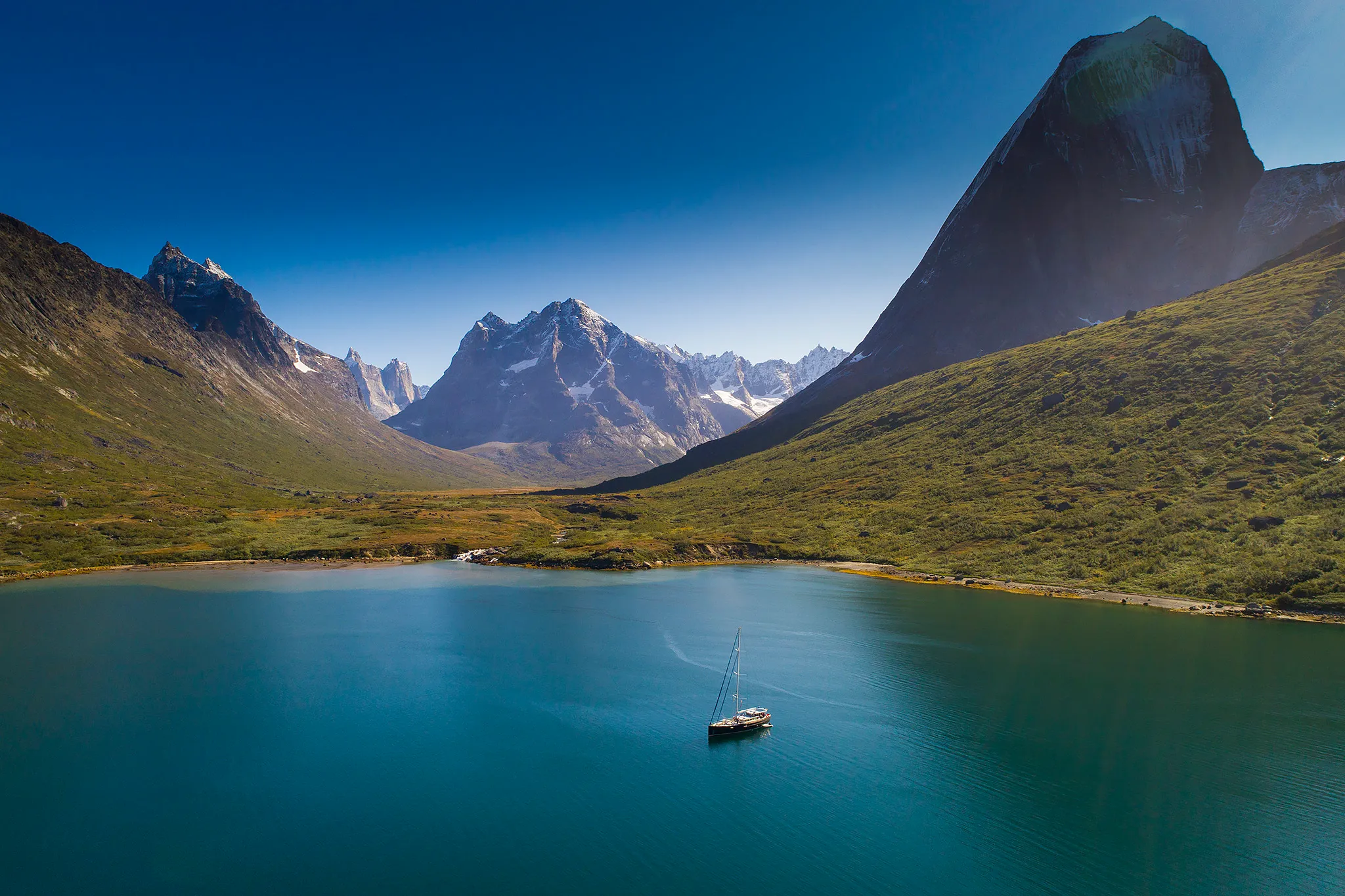 In South Greenland we are met with a fantastic playground for all mountain lovers. With towering peaks, sharp ridges, glaciers, fjords and icebergs until your eyes can’t reach any further. Safely on the coast and in the fjords, we will spend our days hiking, fishing, eating good food and visiting the cute villages here, like Nanortalik and Qaqortoq. Where colourful houses cling on to green hill sides in between the mountains and icecap in the east and north, and the ocean in the south and west. We end our journey all the way into Eriks fjord (Tunulliarfik) with the dinghy as airport-shuttle in Narsarsuaq.