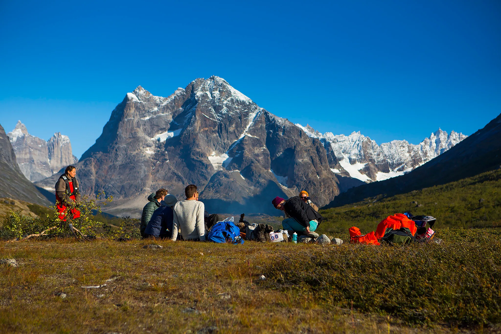This leg is largely dedicated to the incredibly beautiful and alpine landscape we find on the south coast of Greenland. The days at our disposal in these fjords, we’ll spend on hiking and exploring this totally deserted landscape. We’ll find exciting ridges, vertical granite cliffs, green meadows and definitely no roads, cars or civilization for miles and miles. In this stunning landscape we’ll go for summit treks and hiking trips, both in the area around Prins Christians Sund, and the UNESCO World Heritage fjord Tasermiut.