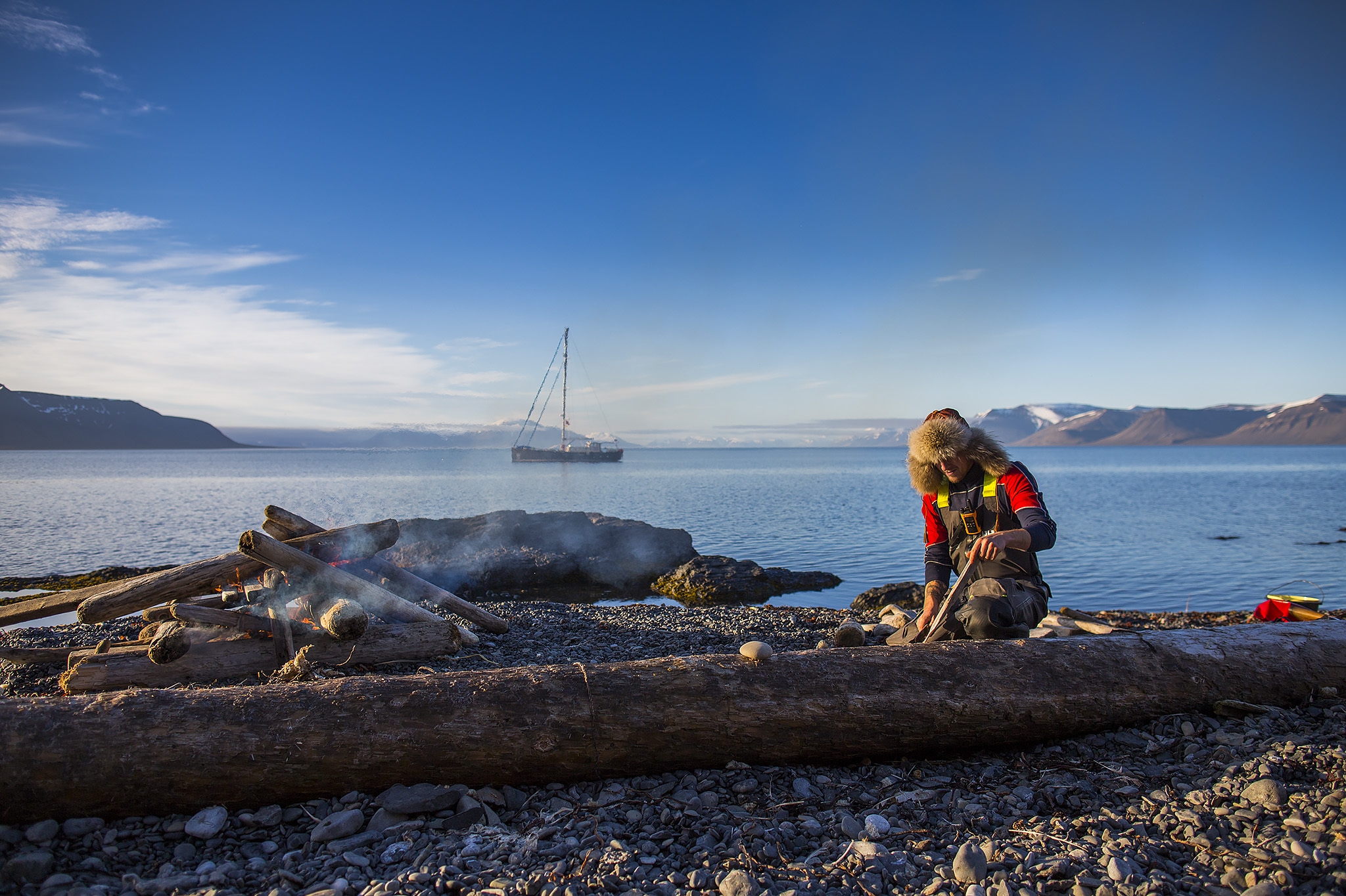 On the way out of Isfjorden we pass Isfjord Radio on Cape Linnaeus. This is a cozy hotel which used to be a radio station which was the Svalbard community’s only contact with the outside world. The journey continues south along the west coast of the island of Spitsbergen, and we plan to anchor in either Bellsund or Hornsund, to look around and stretch our legs. This area is characterized by the typical layered Svalbard mountains that are split by glaciers that calves in the sea. Most likely we will find enough wood to make a fire on the beach, and maybe we will get to do a short hike to one of the nearby peaks.